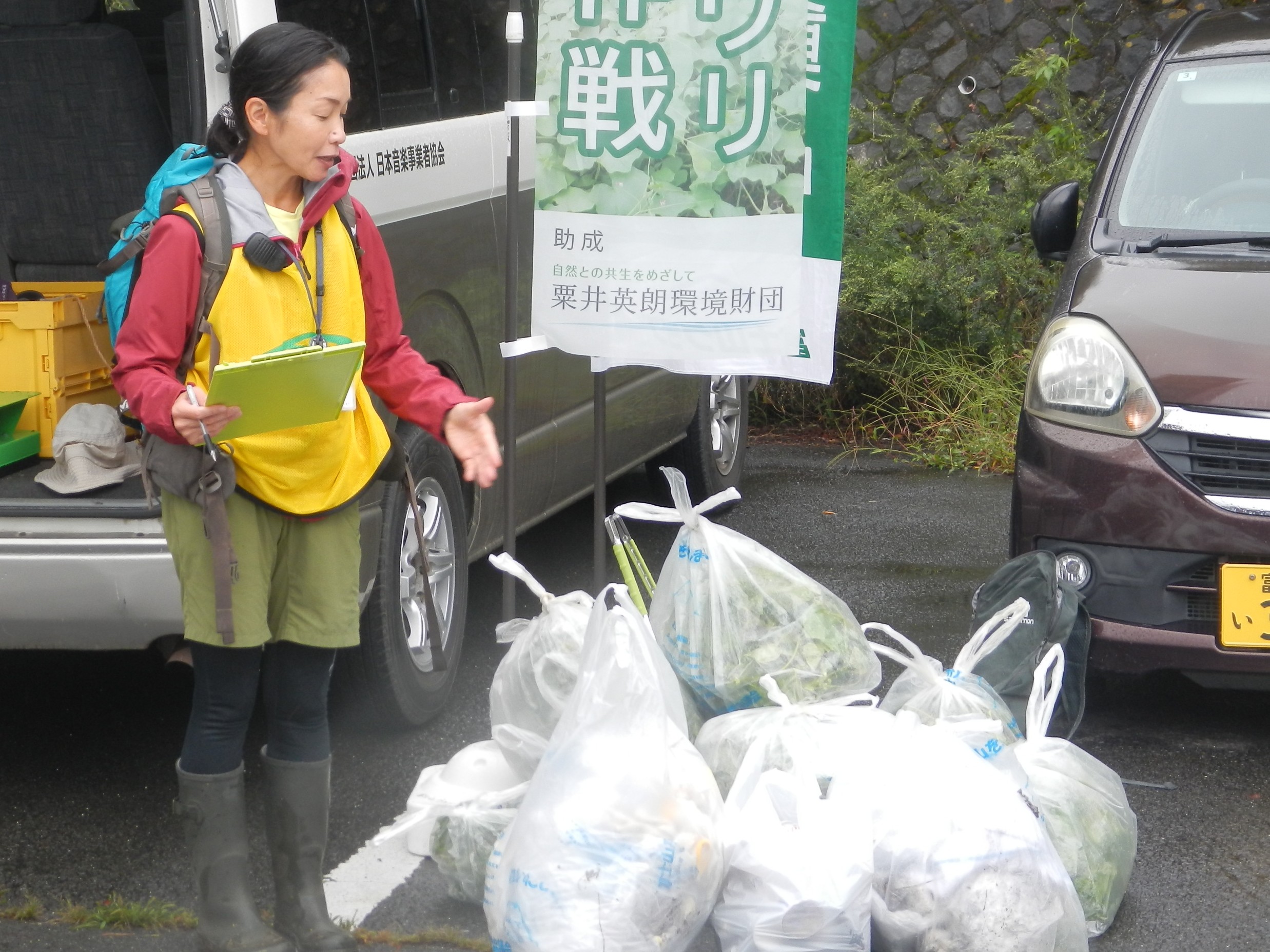 認定NPO法人富士山クラブ様は富士河口湖町に本部を置き、各種環境保全のための活動を展開しているNPO法人で、2012年からはアレチウリ防除活動をスタート。これまで105回の防除活動を行ってこられたそうです。2025年度の粟井財団公募助成対象団体でもあり、助成金で「アレチウリ一掃作戦」登り旗を作成してくださっております。