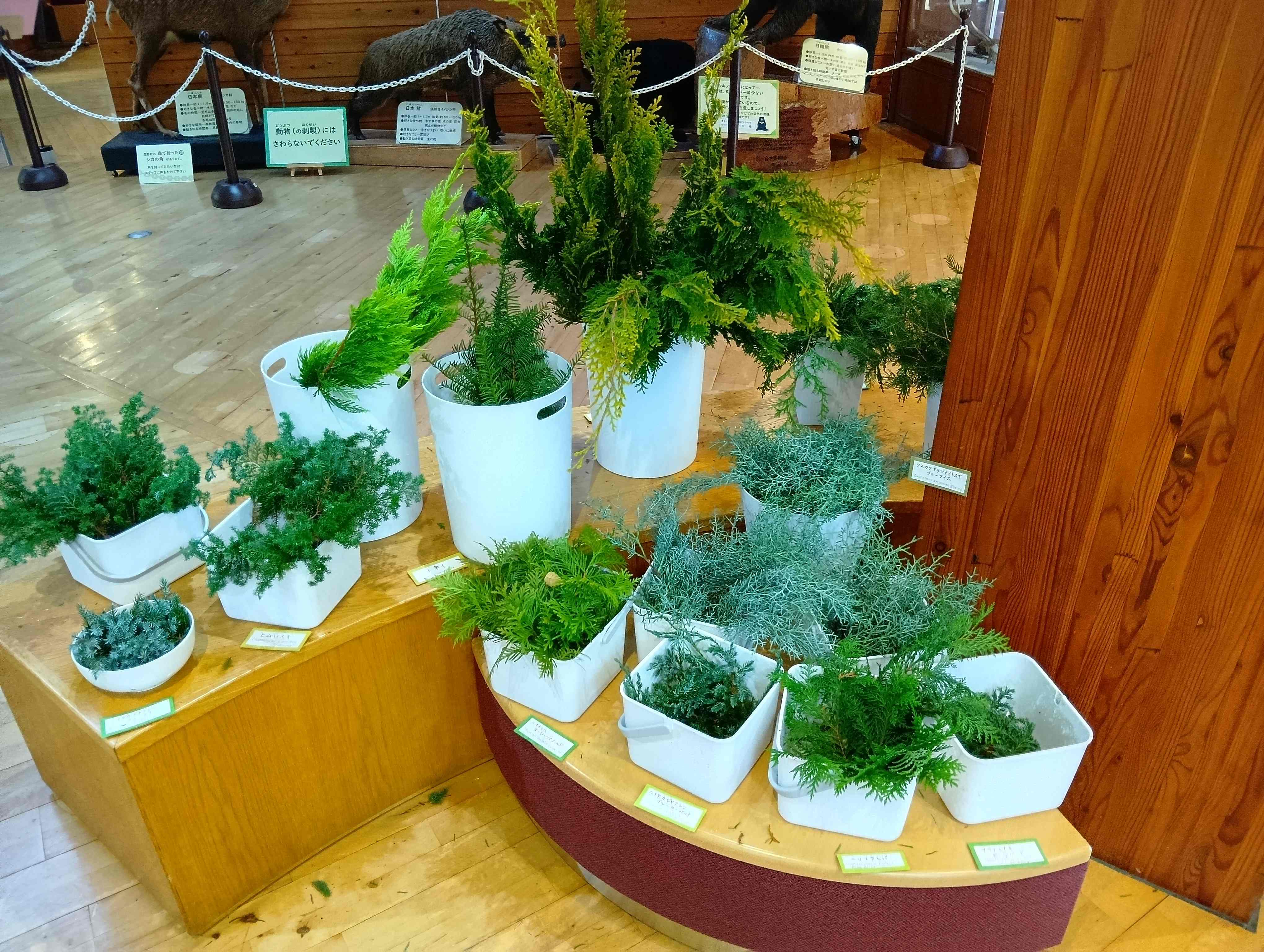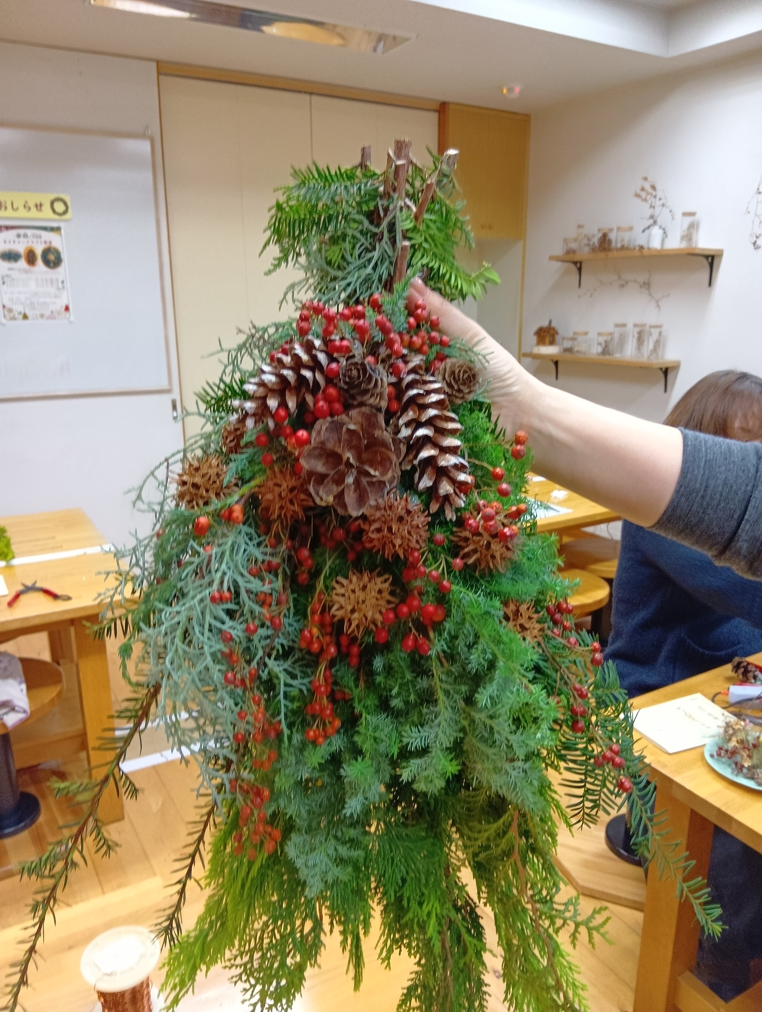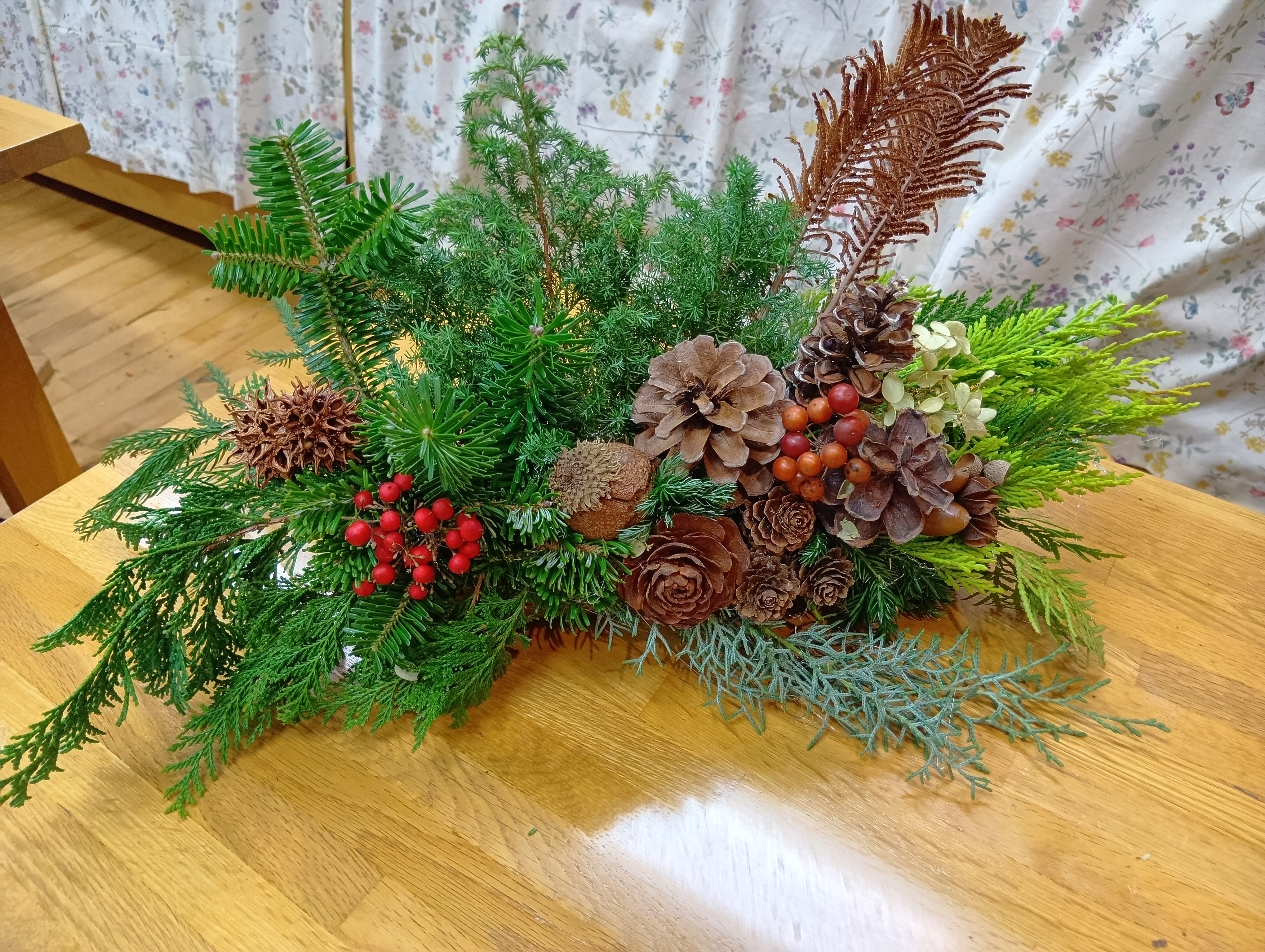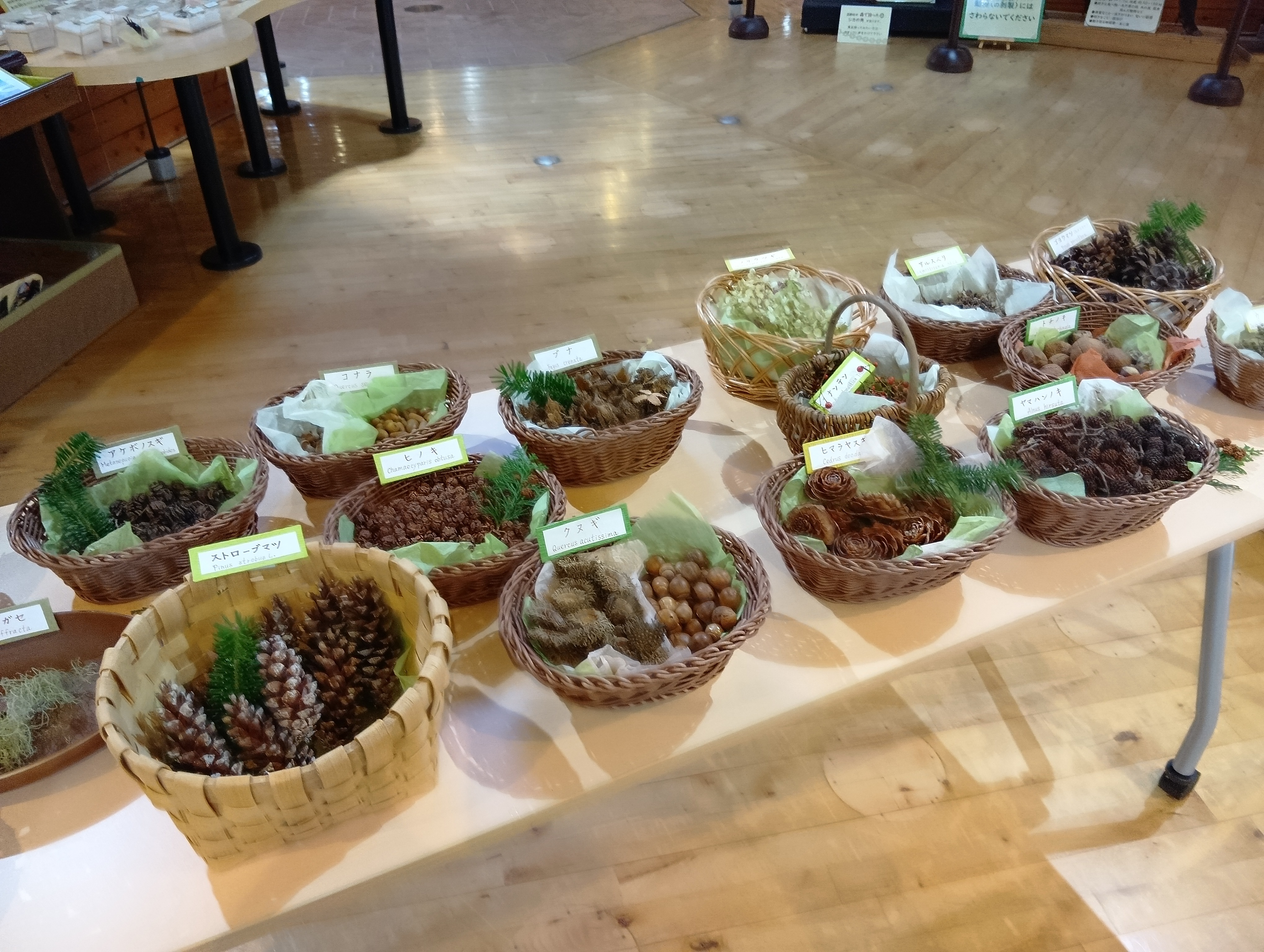 コニファー類からはフィトンチッドの香りが漂い、松ぼっくりやドングリなどの装飾用素材は、その種類の多さと形の愛らしさに参加者からは感嘆の声があがっておりました。