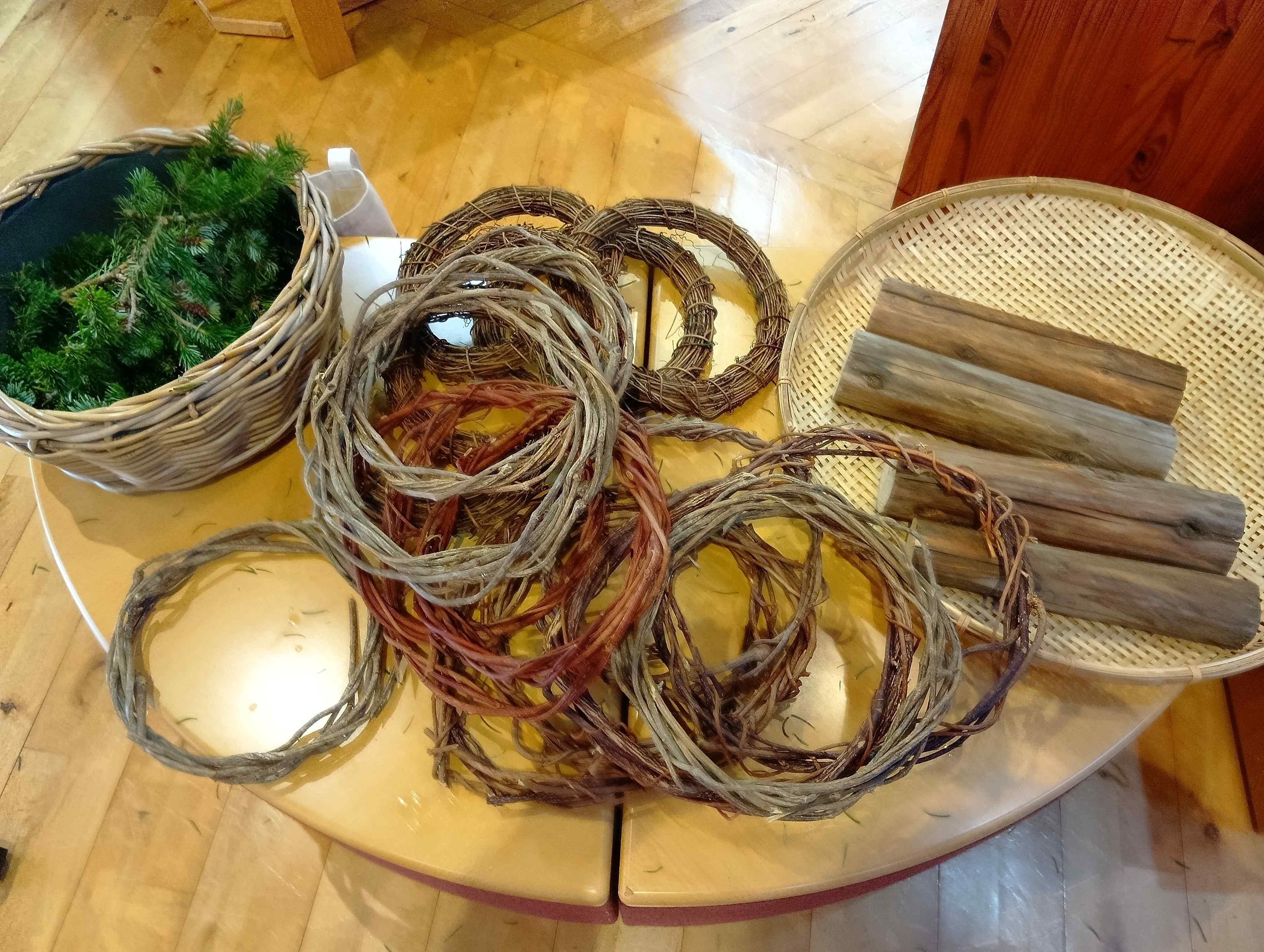 当日は参加者それぞれが、3種類のリース土台から1種を選んでいただいた後、自然素材を土台に飾り付ける作業に挑戦していただきました。